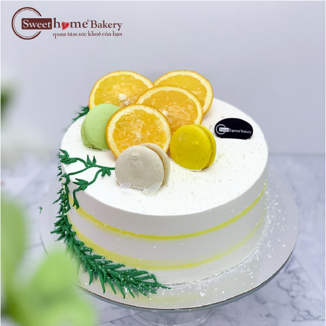 Mô tả sản phẩm: Bánh kem sữa tươi trang trí cam tuơi và bánh maccaron, viền chân bánh bằng hạnh nhân, cốt bánh bông lan truyền thống. Nhân bánh tuỳ chọn (mứt dâu, mứt thơm, mứt việt quất hoặc cacao).